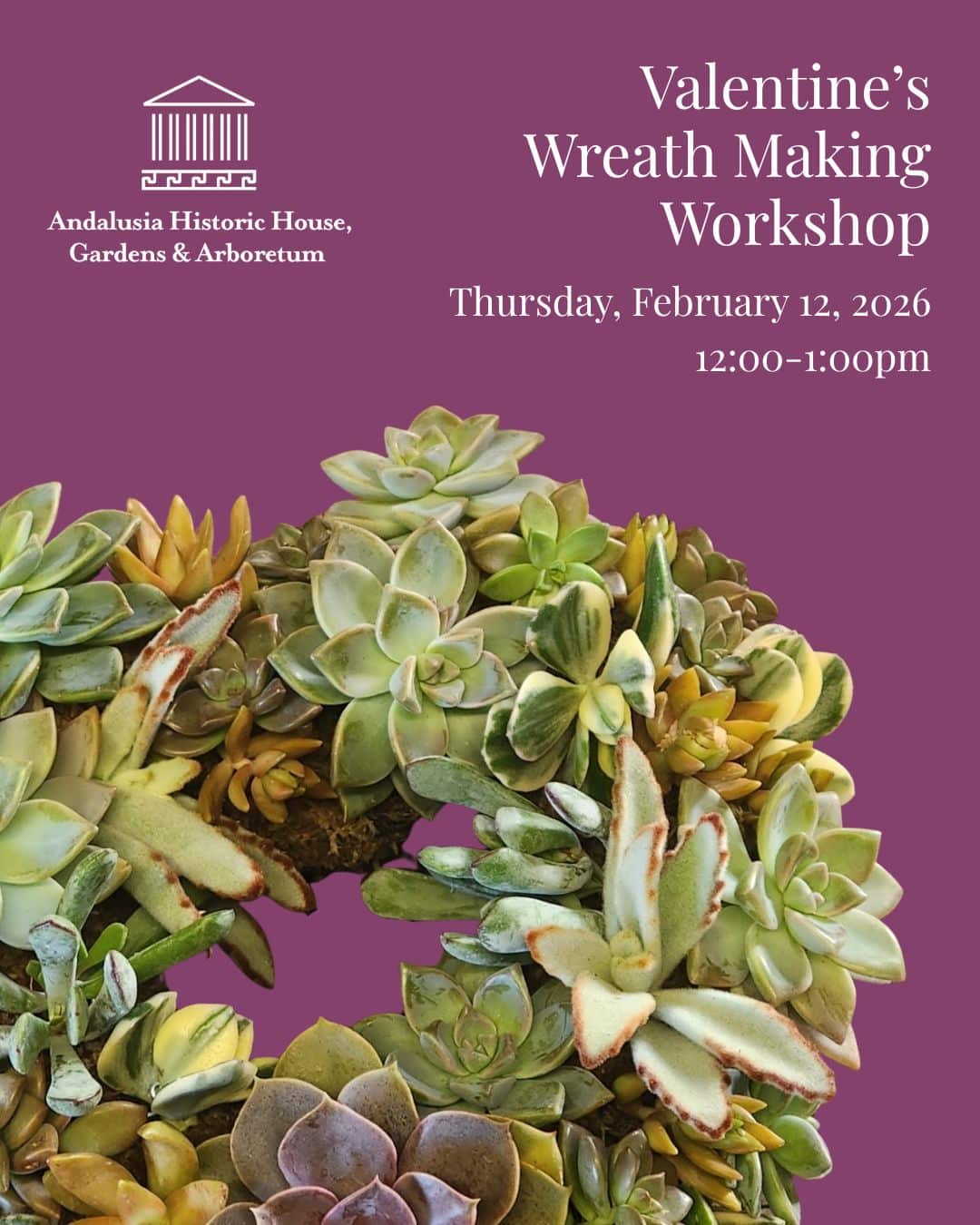 Andalusia is excited to announce our first-ever winter workshop! Join Head Gardener Bill Fuchs and Senior Horticulturist Stephanie Harold as they guide you through a Valentine’s Day-themed wreath making class at Andalusia on Thursday, February 12th at 12:00pm. This one-hour class will allow you to design your very own heart-shaped wreath made from succulents. After the class, you’ll have the rare opportunity to stroll the Andalusia grounds during our winter off-season!